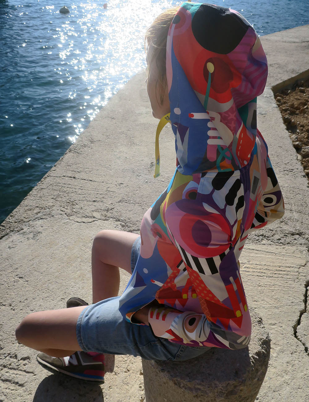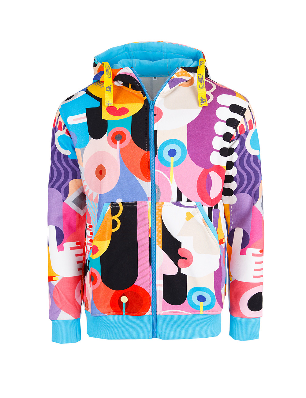 A warm, zip-up hoodie with an abstract cubist motif. Made of digitally printed brushed knit fabric (95% cotton / 5% elastane) with a weight of 300 g/m².