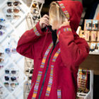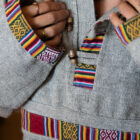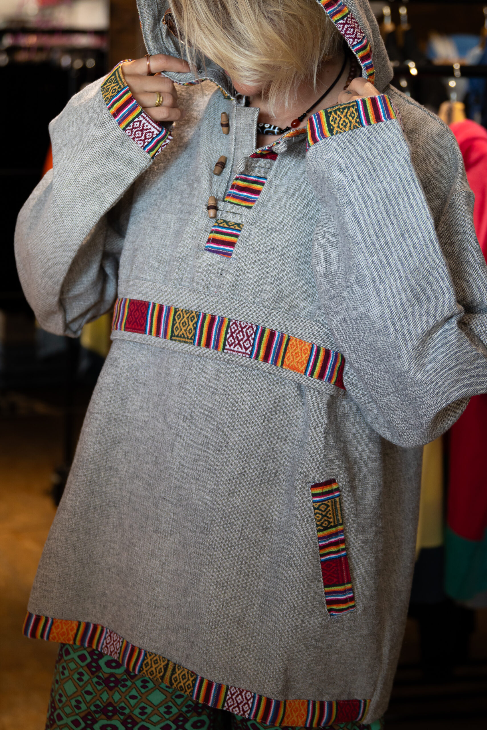 This hoodie, made in Indonesia, is lightweight, breathable, and decorated with colorful ethnic inserts.