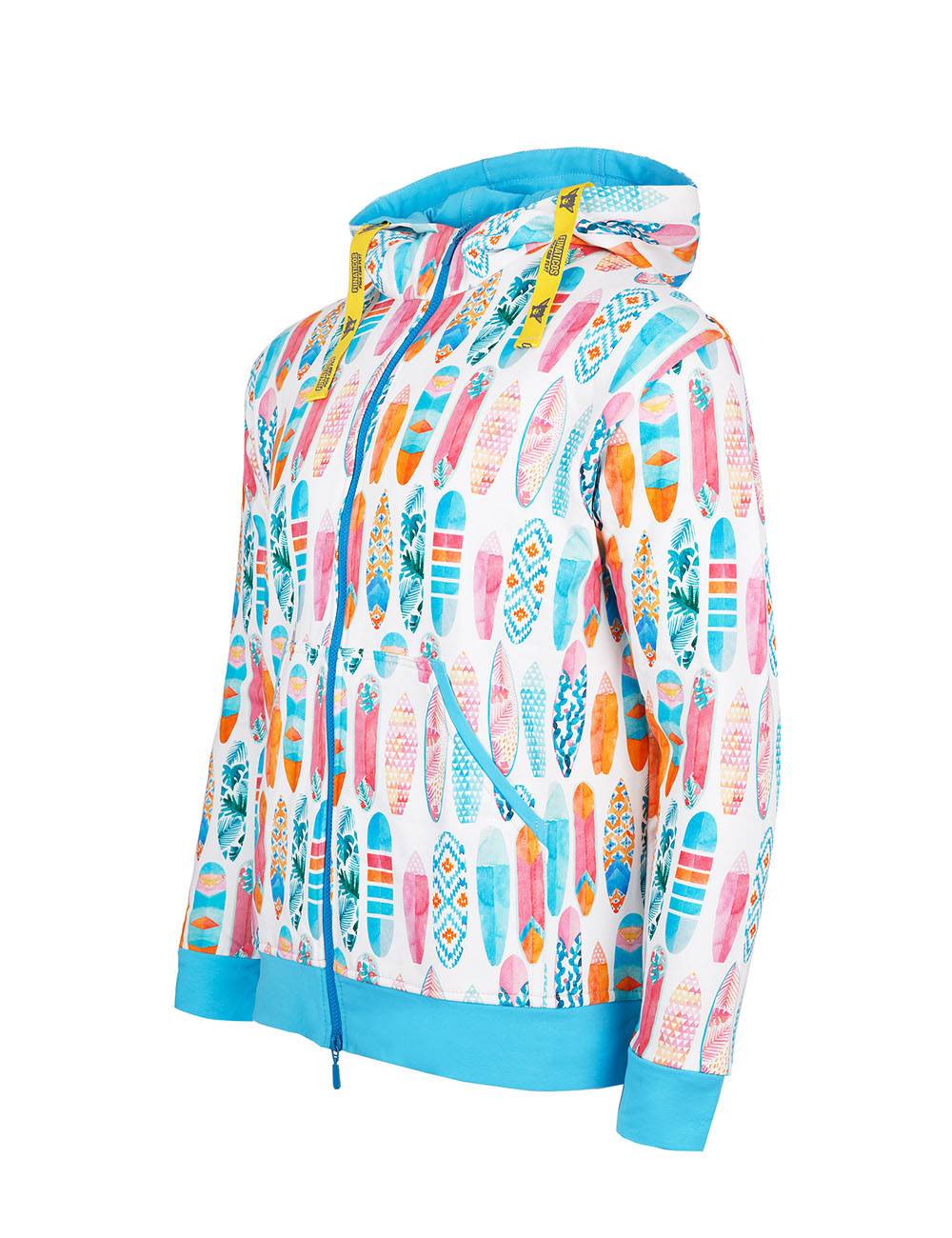 A warm, zip-up sweatshirt with a surfer vibe. Made of digitally printed, brushed knit fabric (95% cotton / 5% elastane) weighing 300 g/m².