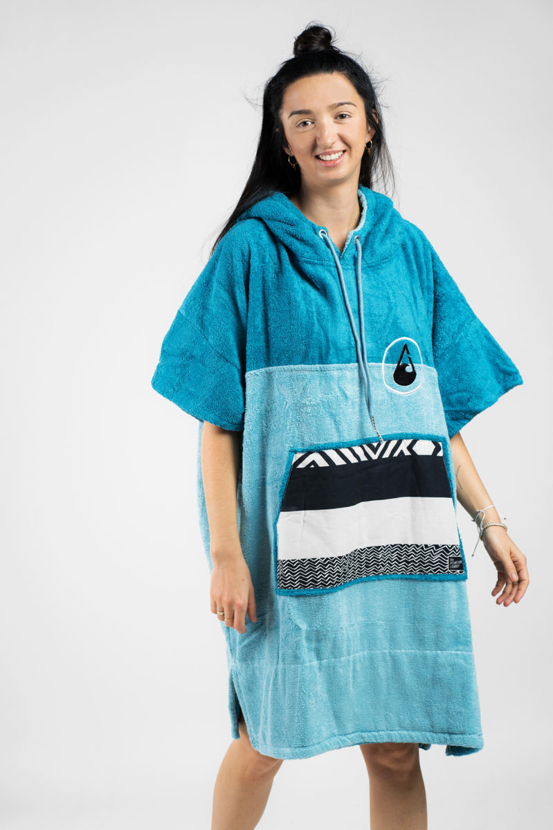 The WAVE HAWAII Ponchino Air is an elegant, blue poncho.